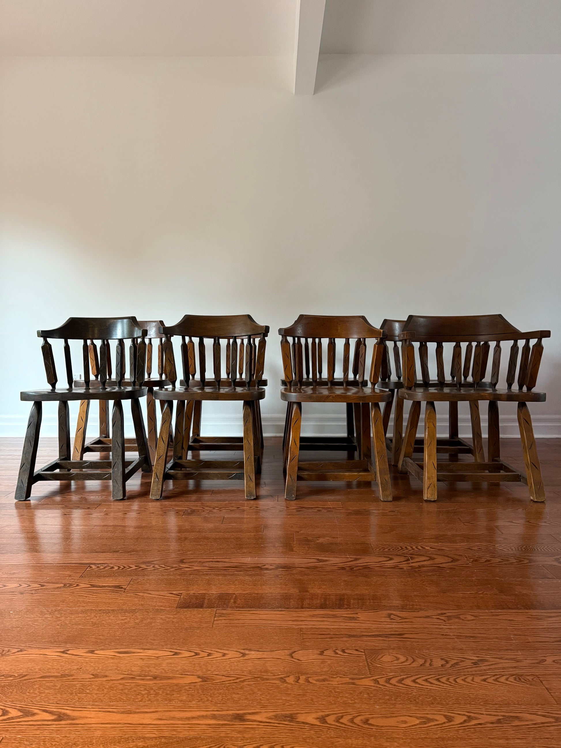 Solid oak dining chairs from the iconic Zum Rhein restaurant in Toronto. Structurally sound with age related wear. These would fare well back in a restaurant and-or as dining chairs where the character lends to your design. Beautiful carving details throughout legs and backrest [see photos].