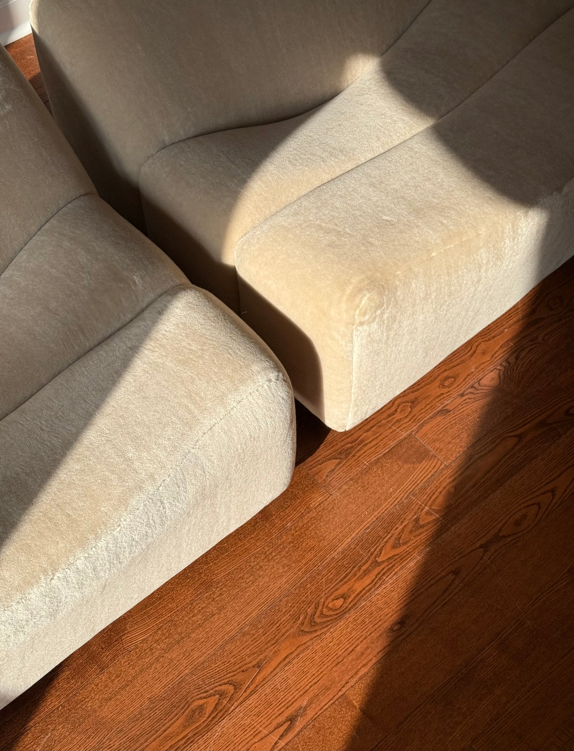 ABCD lounge chairs by Pierre Paulin for Artifort. Made in France, 1960s. Chairs have been carefully reupholstered in a crème coloured Pierre Frey teddy mohair composed of 65% mohair and 35% cotton. This particular example exceeds 85 000 Martindale rubs [extremely durable]. All 4 castors are functioning and perform like new. New trim fabric at underside of sofa.
