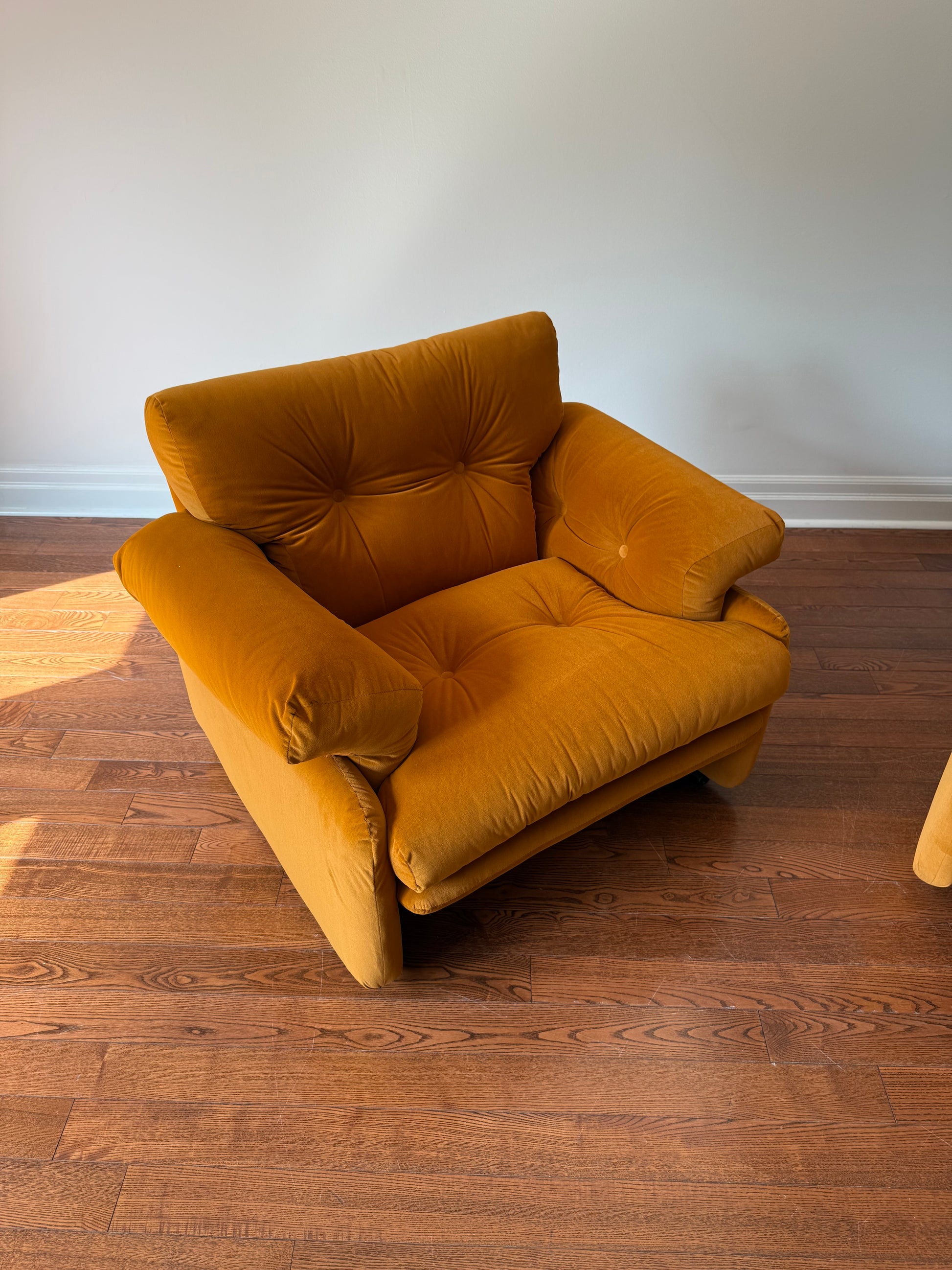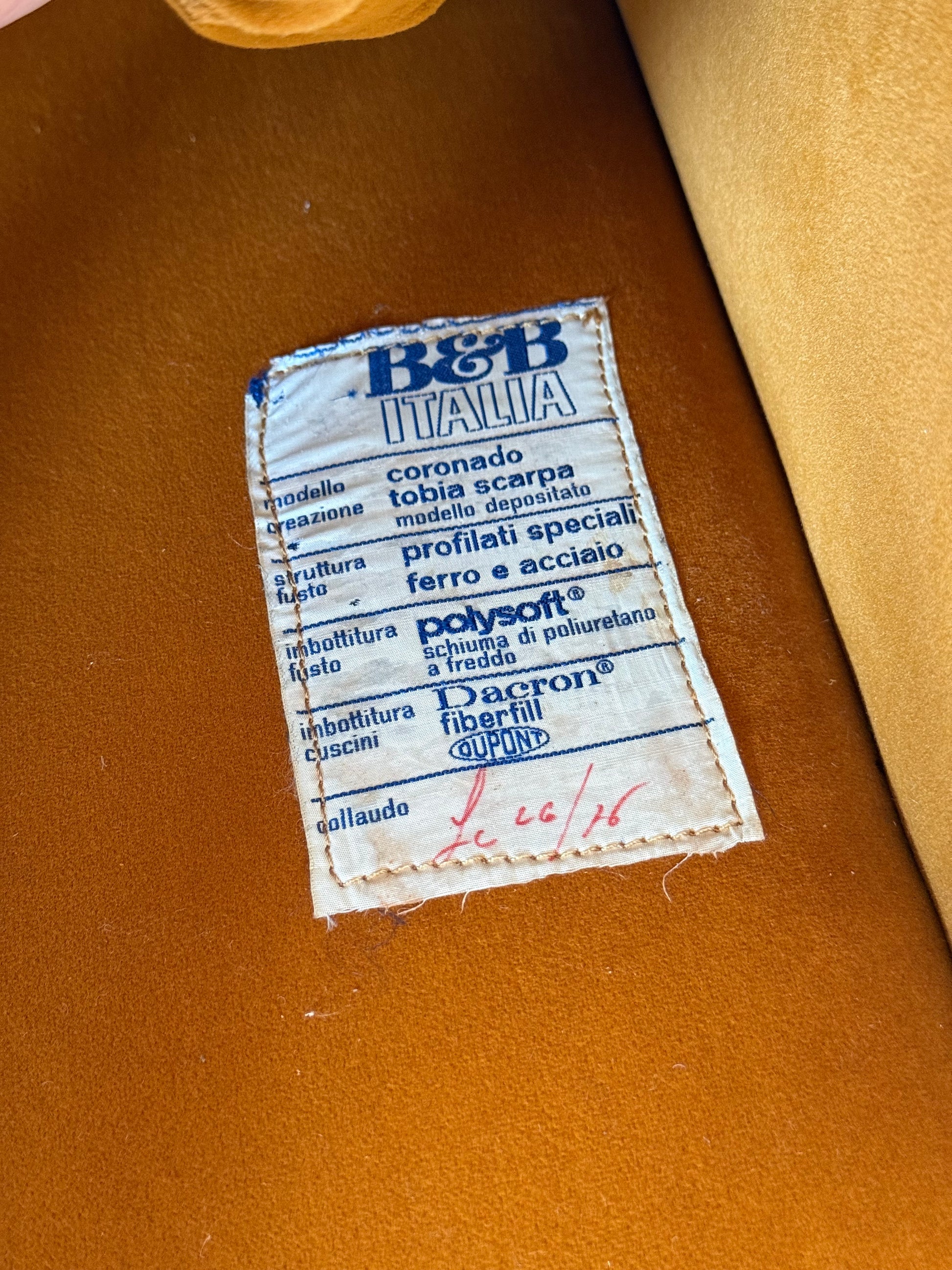 Design care of Afra & Tobia Scarpa for B&B Italia. Made in Italy, 1960s. Reupholstered in a burnt caramel coloured velet and in like new condition as a result. Lounge chairs retain original maker's mark [see last photo].