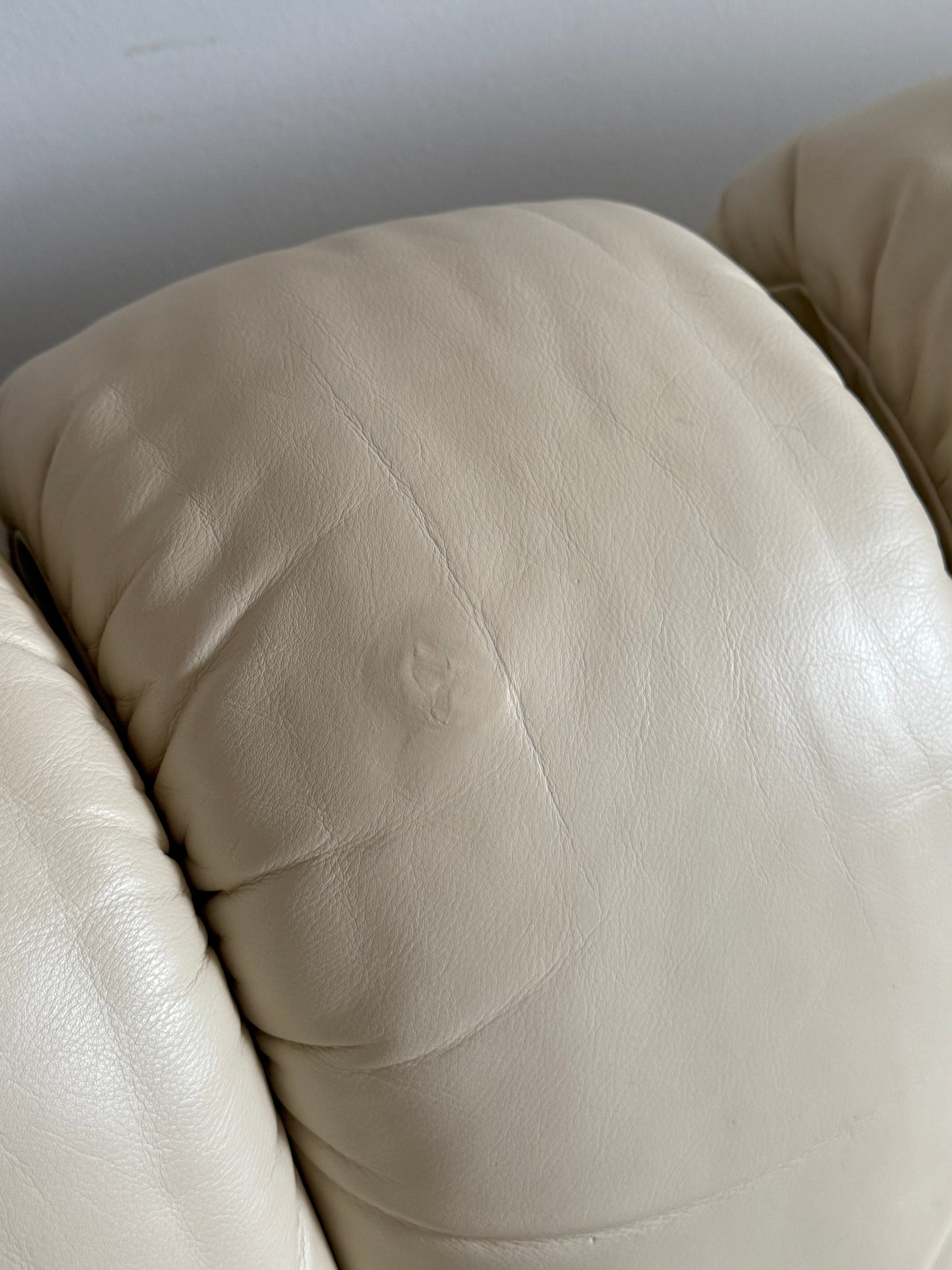 Consisting of 13 elements, 11 middle elements and two corner/armed elements, this particular leather is ivory or "off white" in colour and almost as good as it gets in terms of wear given its age. Leather is full grain; thick and durable yet soft and supple. de Sede is known for their work with leather having originated as a saddle making atelier. Below is list of what minor deficiencies are present [all pictured]: