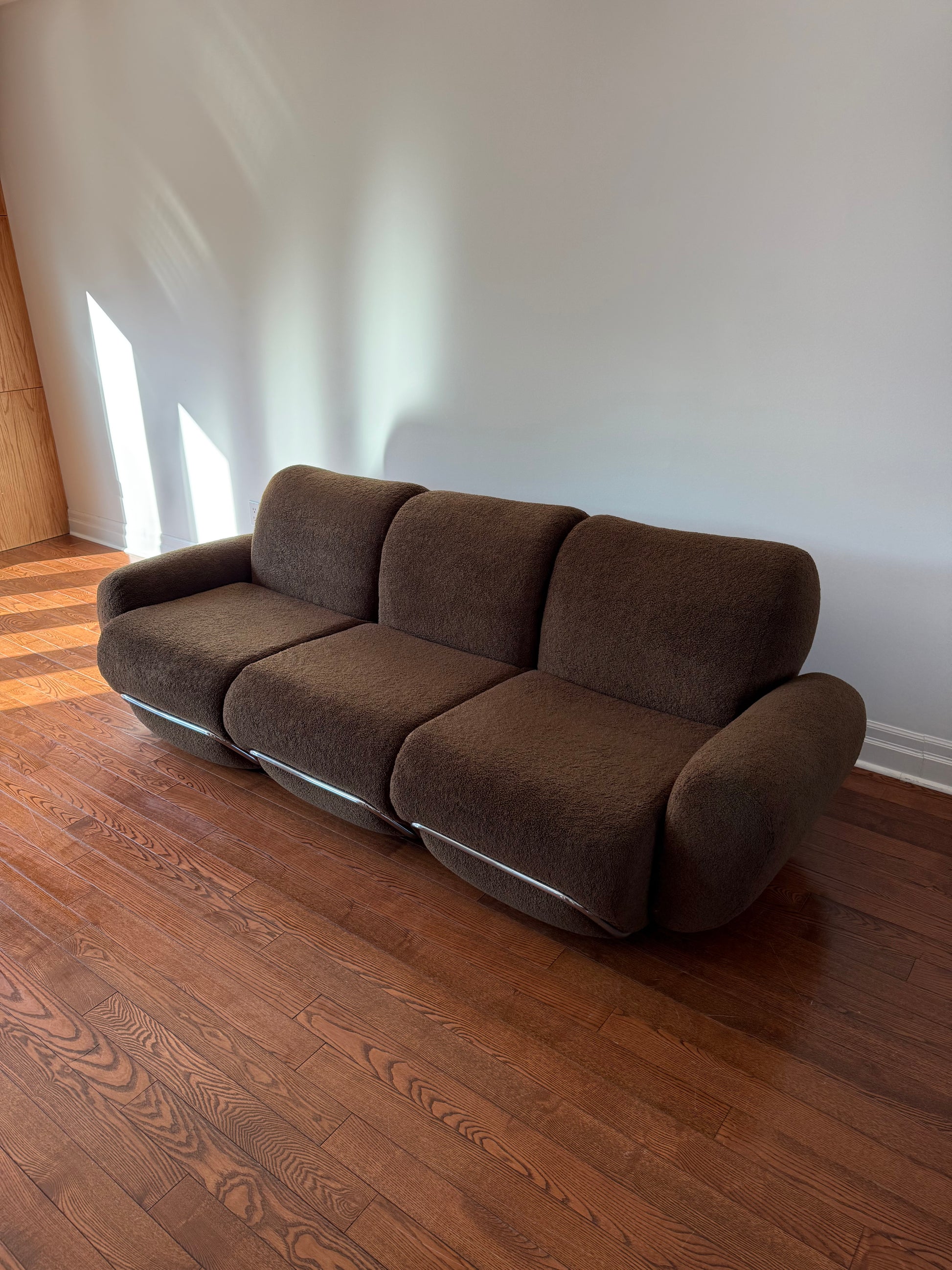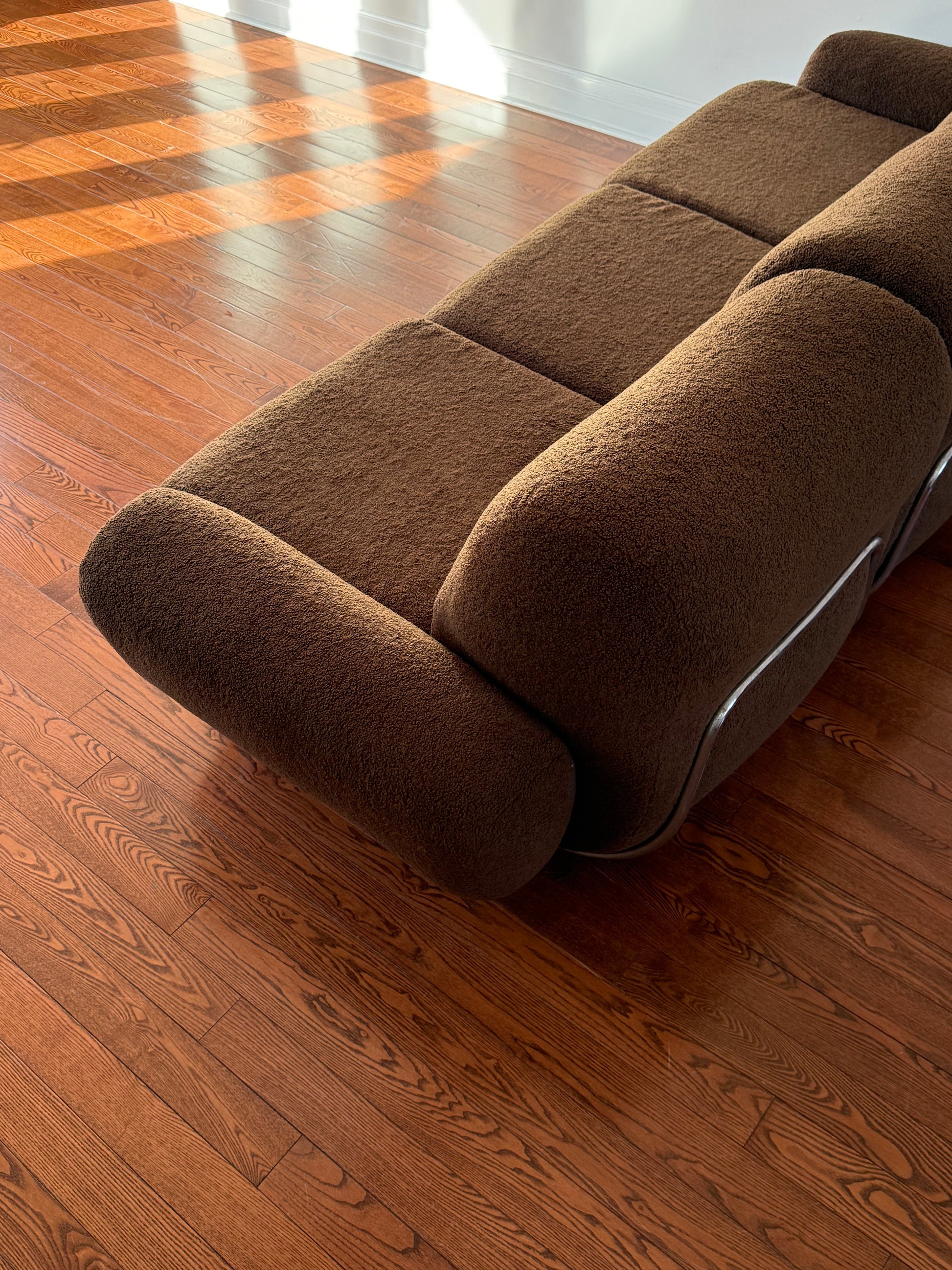 Italian modern sofa from the 1970s attributed to Adrian Piazzesi. Reupholstered in a polyester chocolate brown boucle. Tubular chrome frame is in good condition with some minor oxidization, par for something of this vintage.