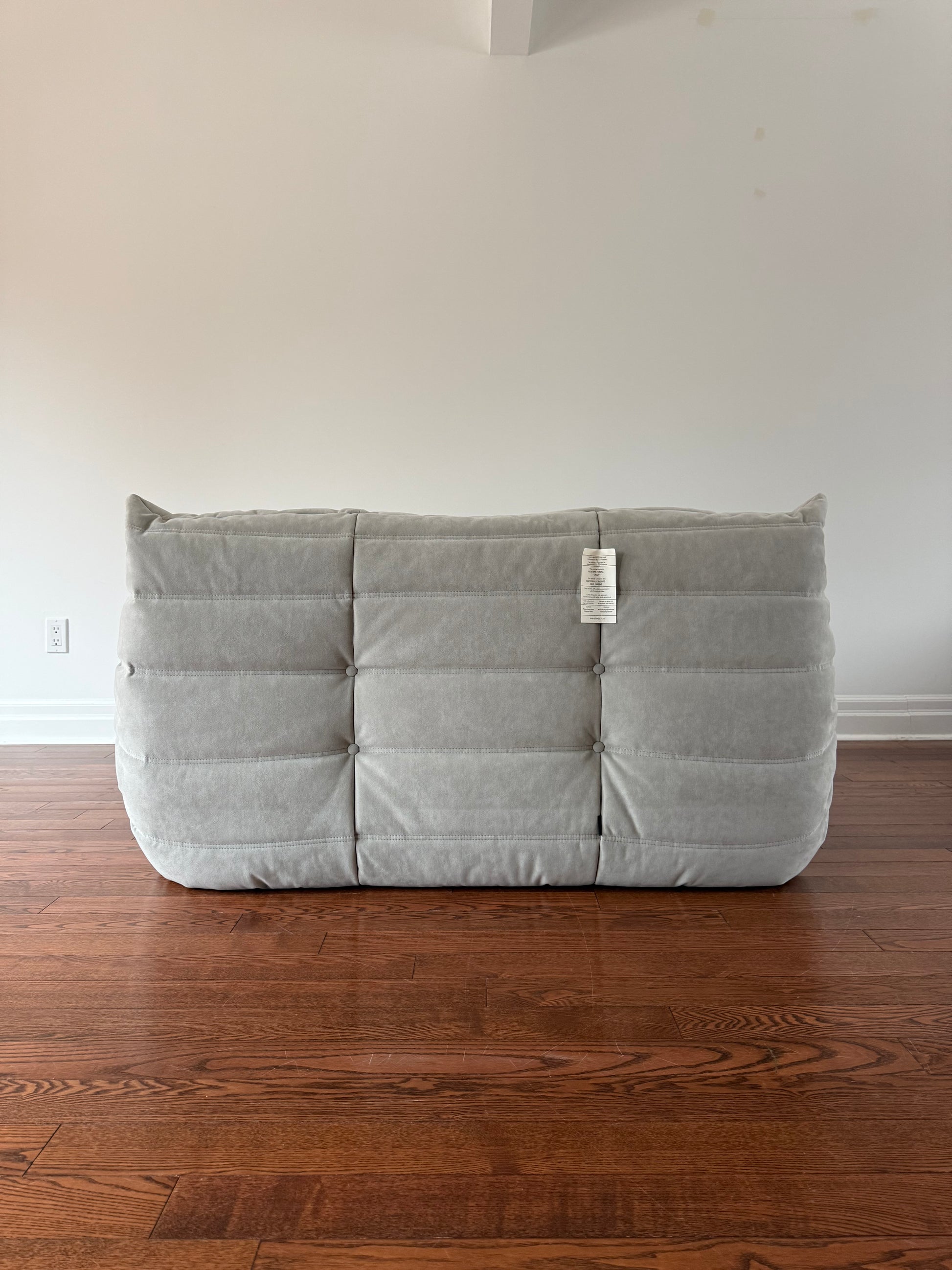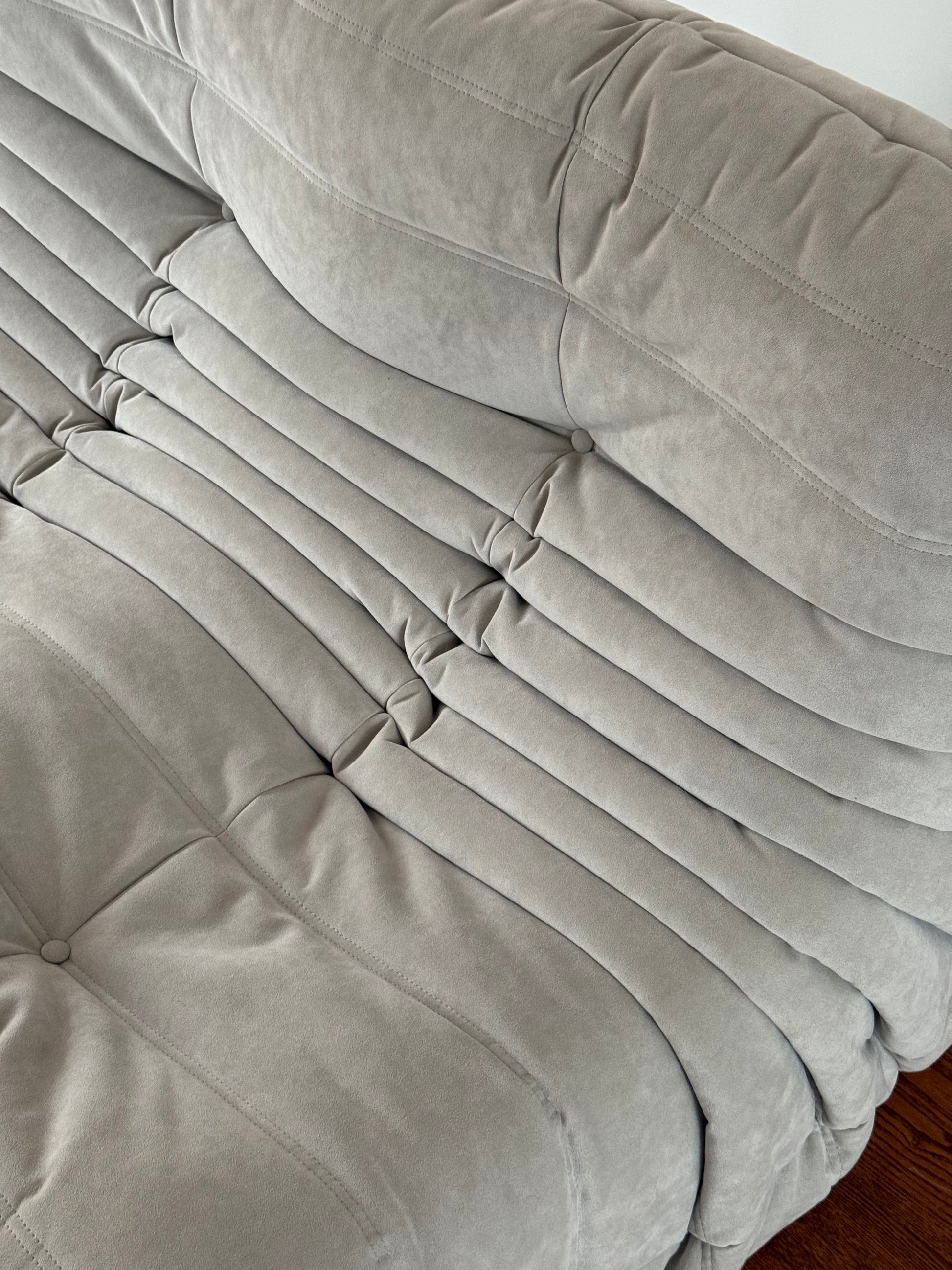 Design care of Michel Ducaroy. The iconic Togo produced by Ligne Roset of France just surpassed its 50th year in production. This example is a few years new, purchased from Home Societe and used majorly for staging properties for listing. Pearl Grey Alcantara upholstery is in like new condition as a result and still retains original manufacturer's tag at back. Ligne Roset, Made in France tab also present at back.