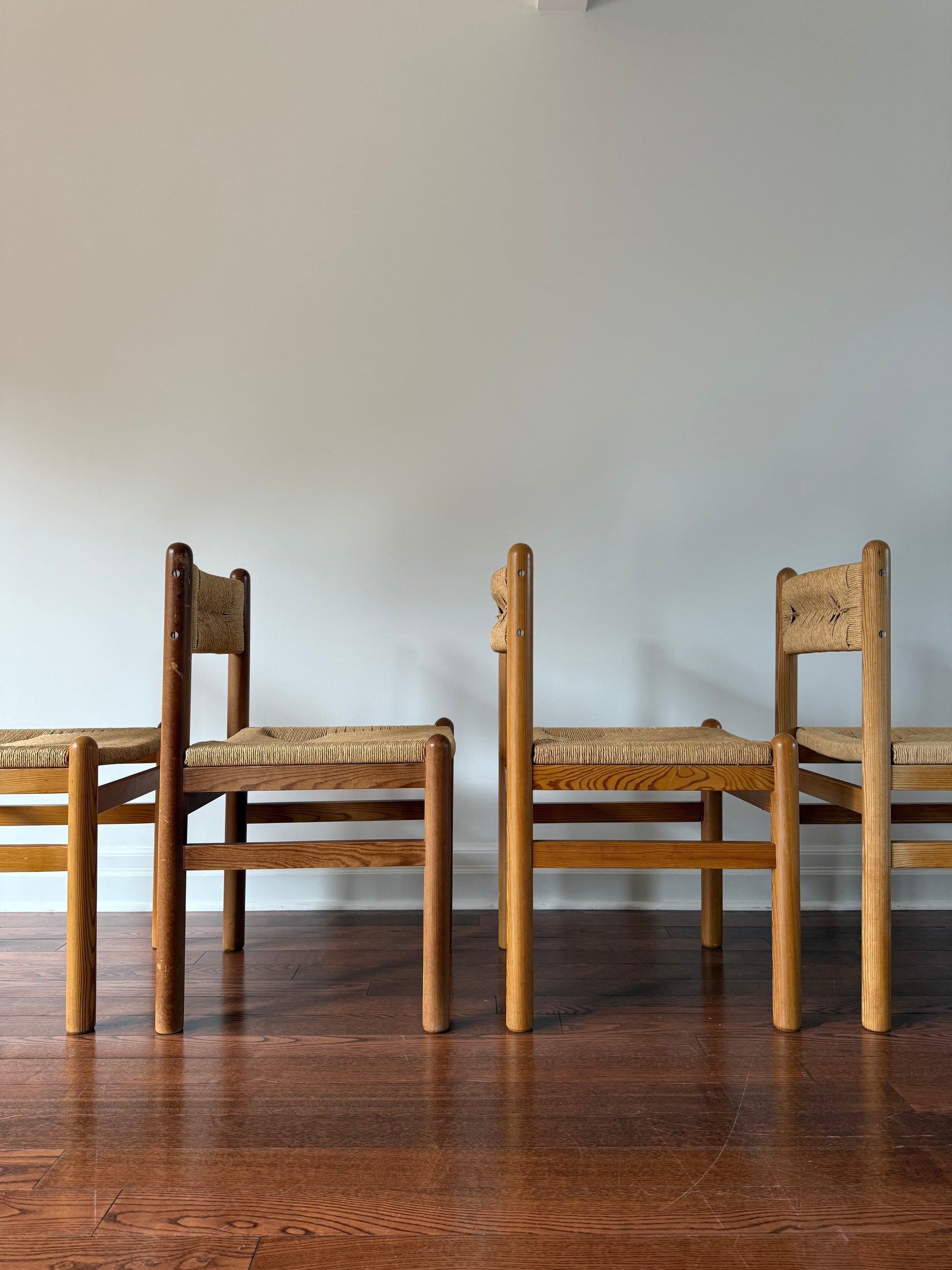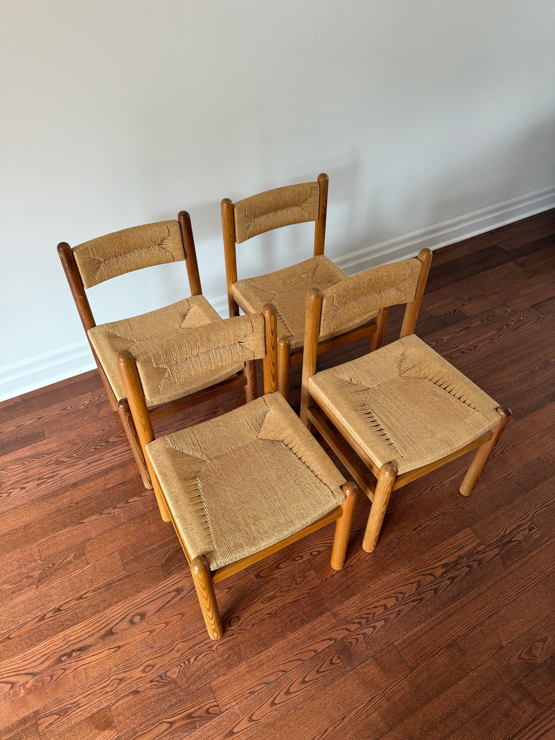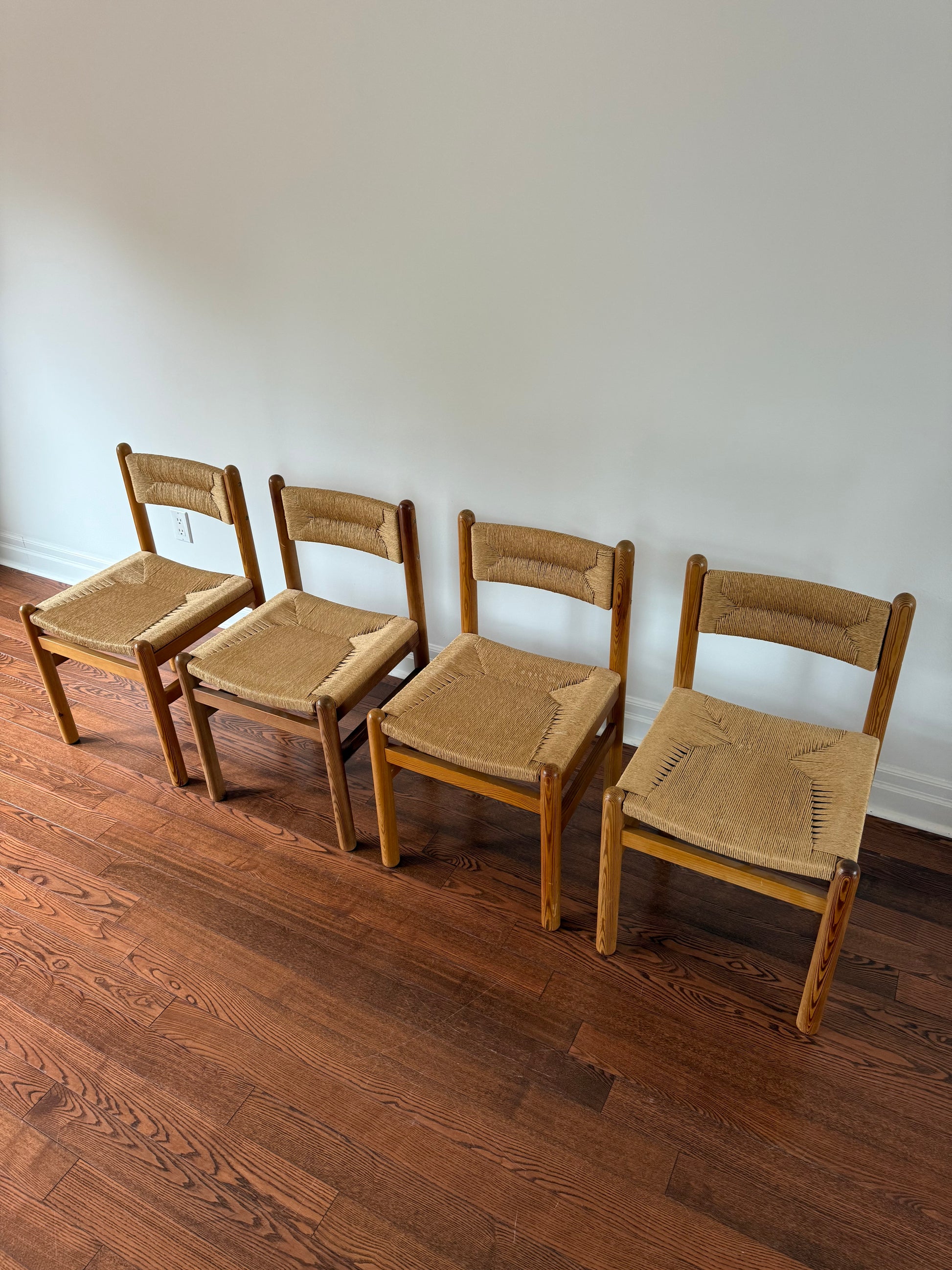 In the style of Charlotte Perriand. Solid pine frames with seagrass woven seat and back rests. Exposed fasteners on sides of backrest uprights. In excellent vintage condition. 44" round matching dining table also available.