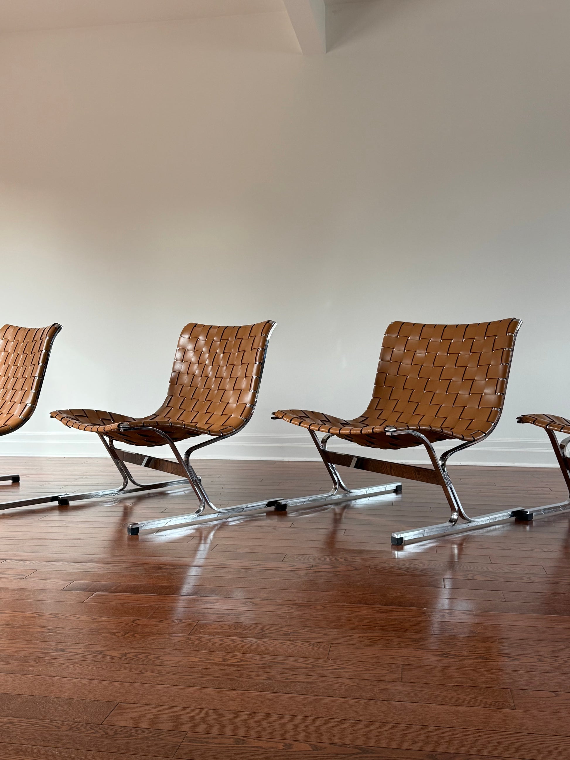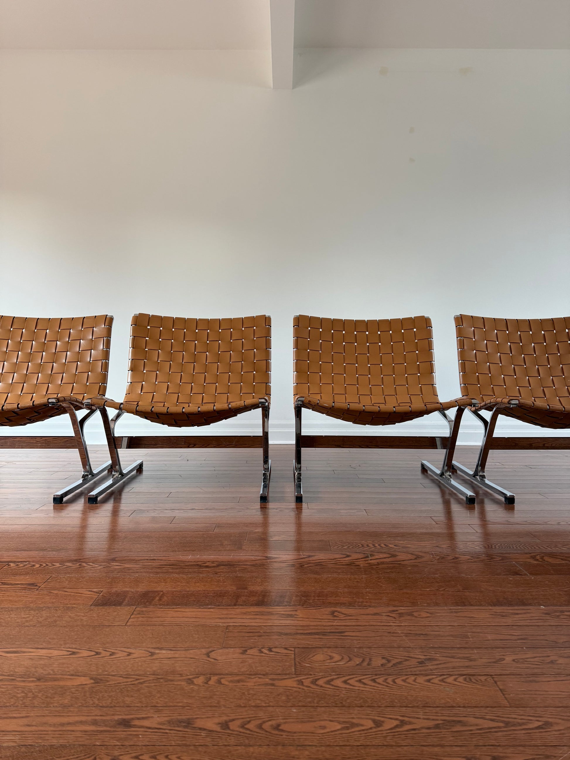 Design care of Ross Littell for ICF De Padova. Made in Italy, 1960s. Chrome plated steel structure with interwoven leather seat and back. In overall great vintage condition given their age; some minor pitting in inconspicuous areas as well as minor wear to leather strapping at edges [see last photo].