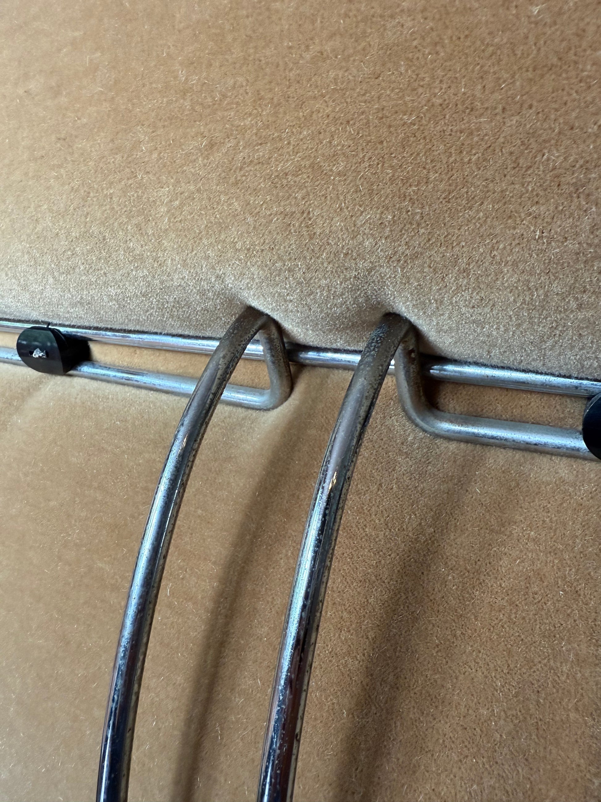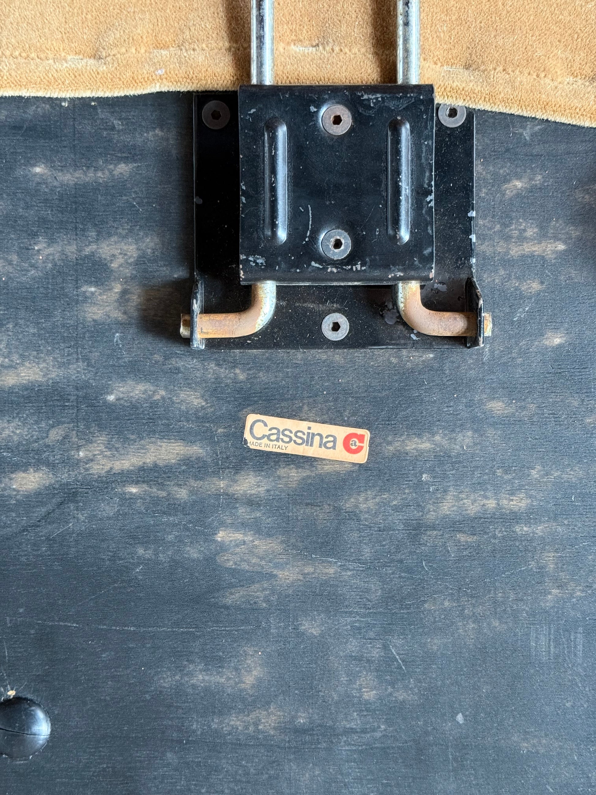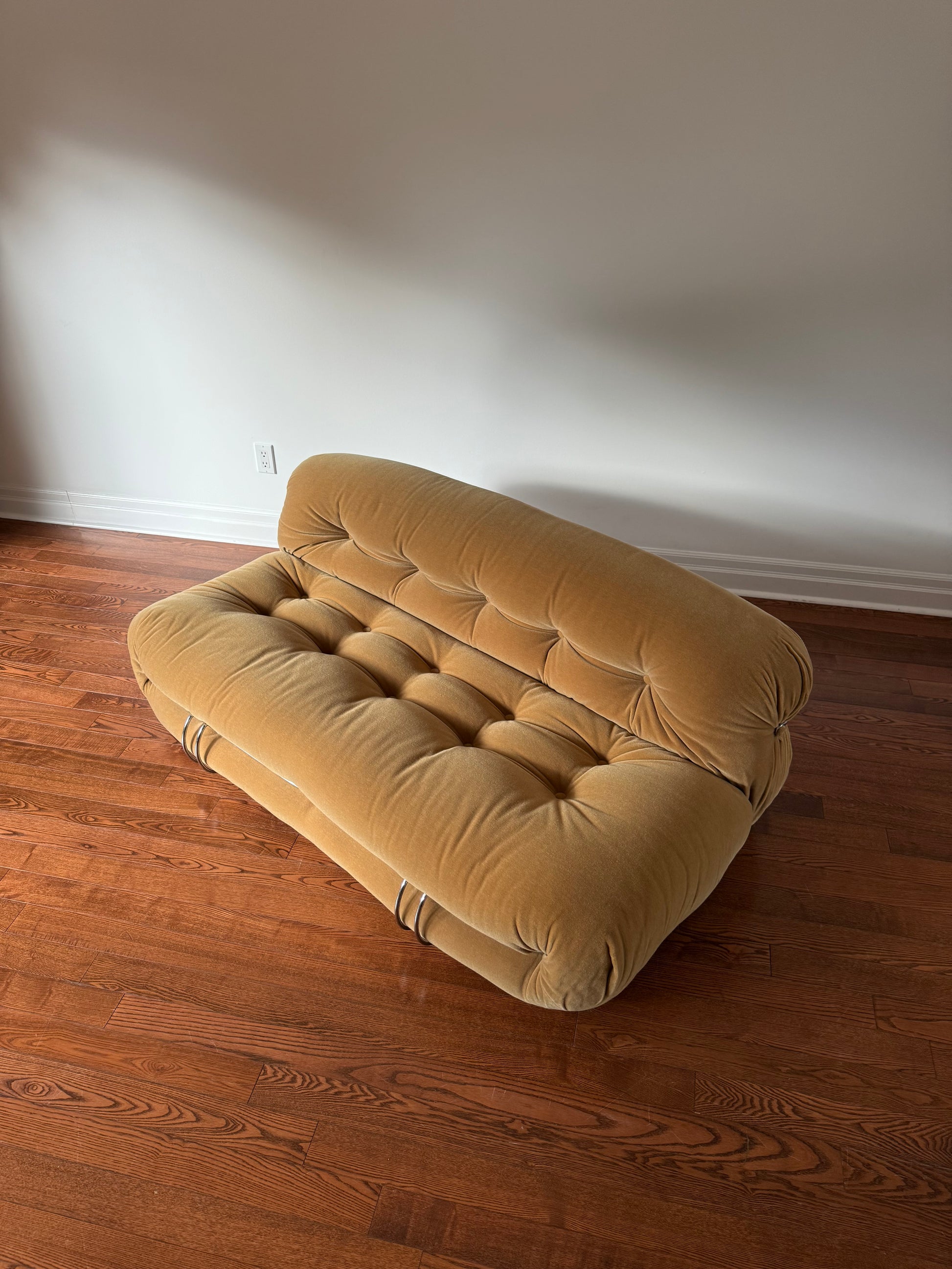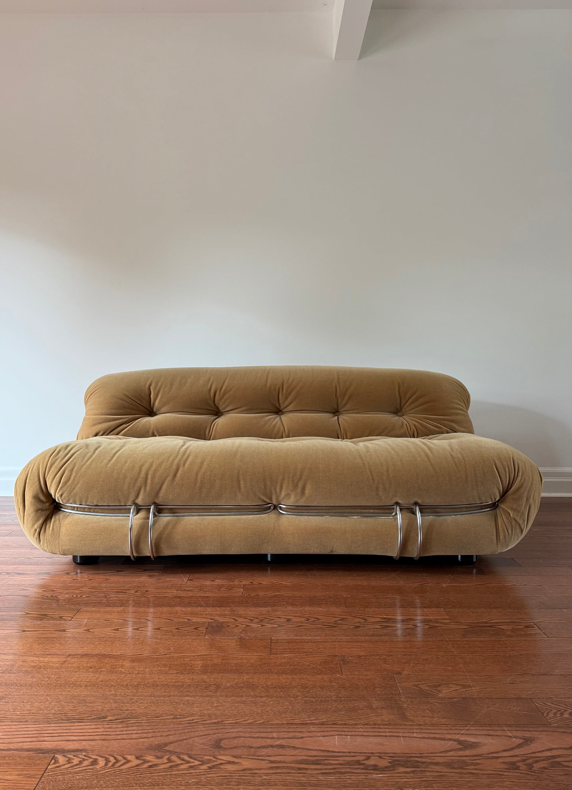 Design care of Afra & Tobia Scarpa. Manufactured by Cassina. Italy, 1969. Winner of the Compasso D'oro award in 1969. Reupholstered in a tan mohair velvet courtesy of Pierre Frey, France. Some oxidizing on chrome trim; par for something of this vintage [see second last photo for example]. Sofa is supported by 6 plastic OEM feet. Original Makers label present at underside.