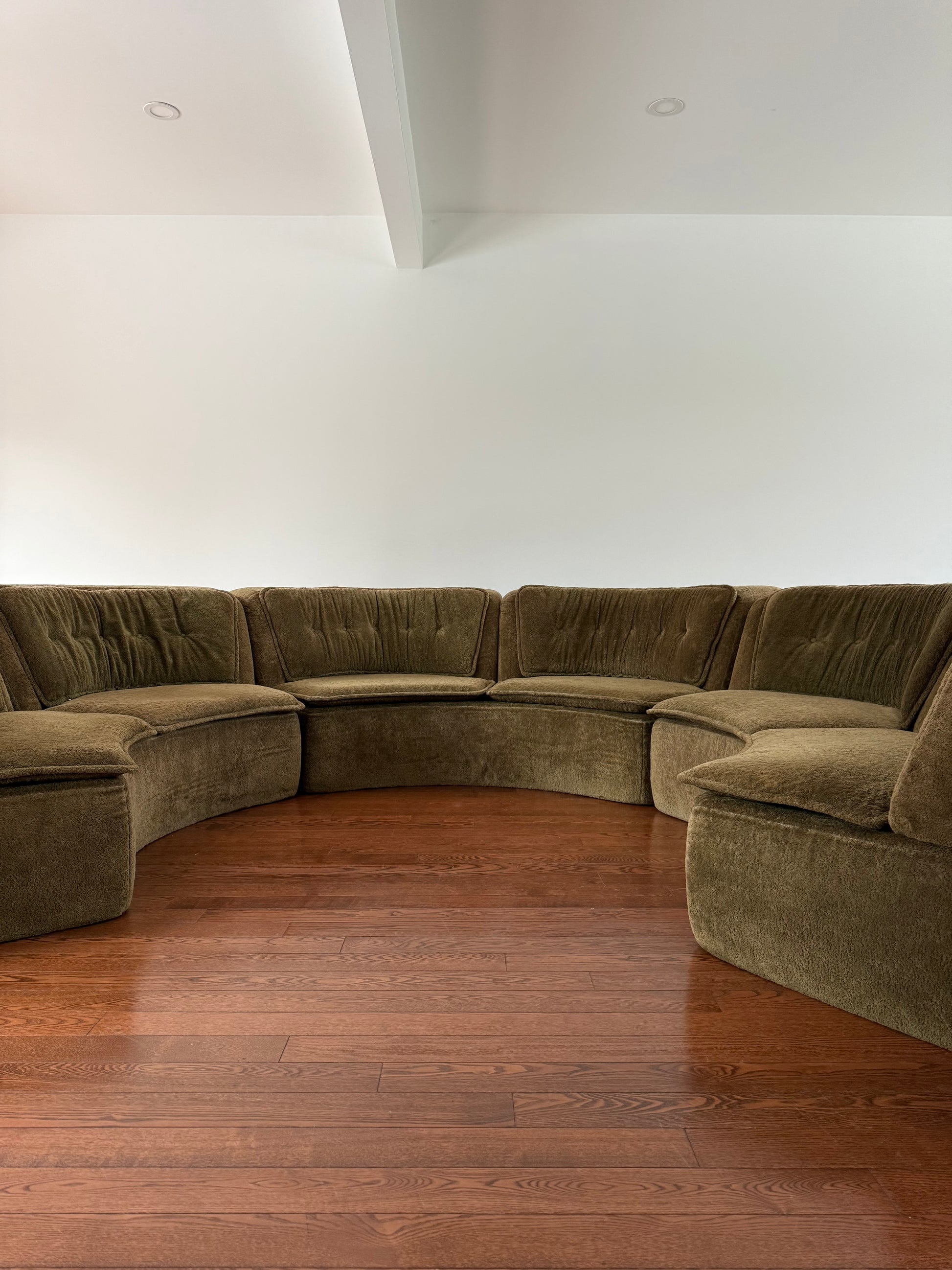 Circular sectional sofa in good condition with age related wear. Assumed vintage, 1970s as per previous owner. Upholstery is a khaki green teddy like fabric. Sofa consists of 3 semi circular seat sections, 6 seat cushions, 6 backrest sections and 6 backrest cushions all as individual elements.