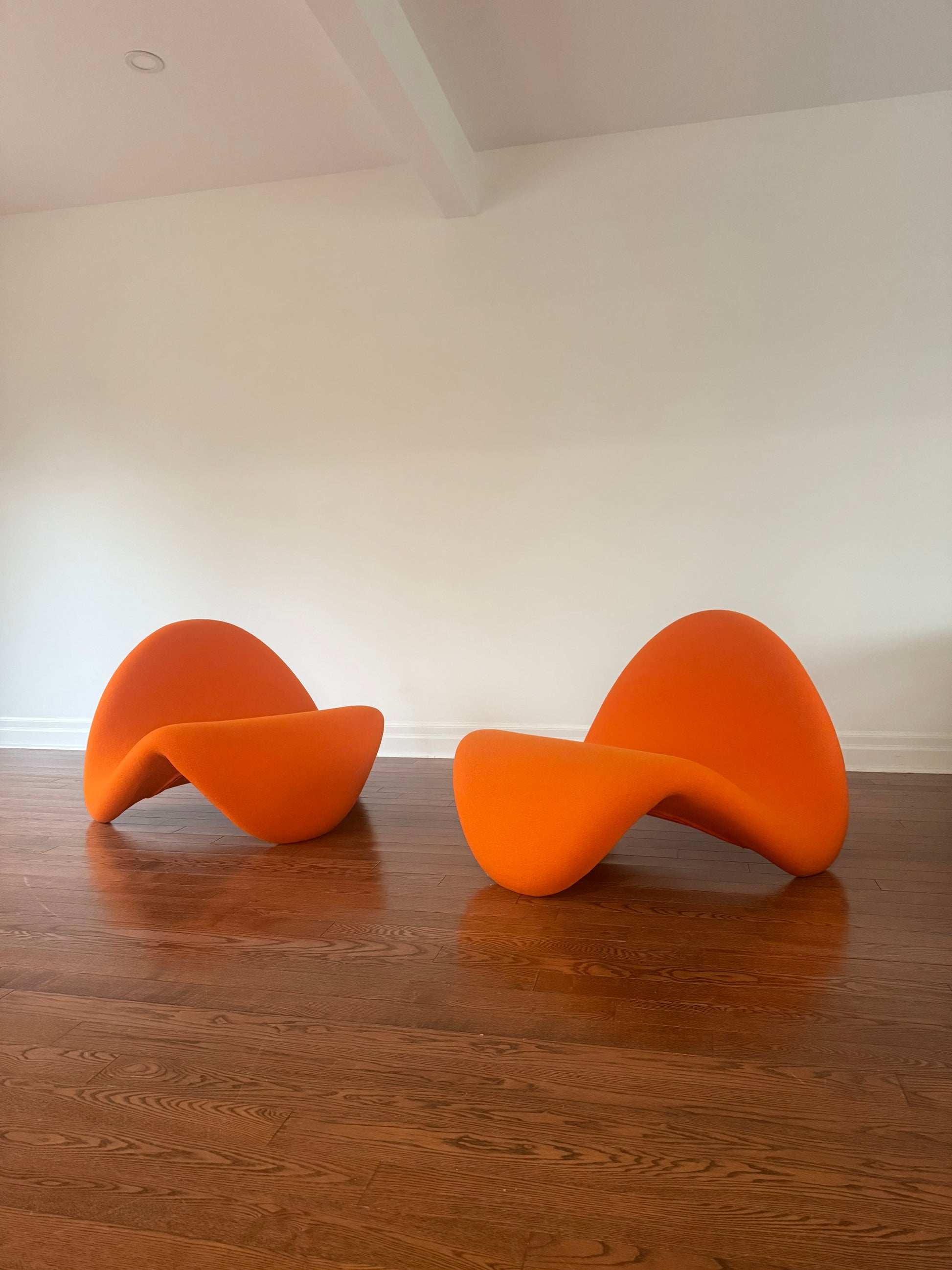 Design care of Pierre Paulin for Artifort, Netherlands. Made in 1960s. Since given a second lease on life with brand new orange upholstery. 4 available. Incentives for buying in denominations of 2 or more.