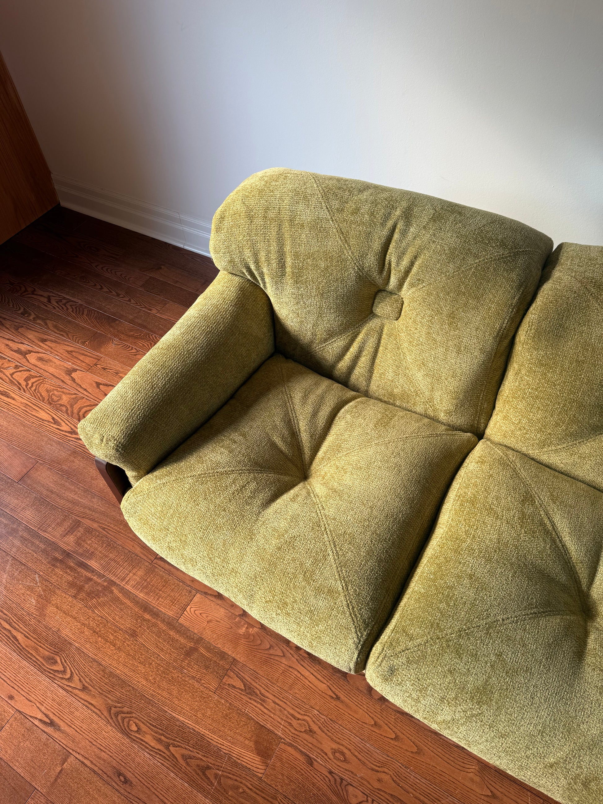 Vintage brutalist sofa with various hard wood layered side panels. Reupholstered in an avocado green fabric composed of polyester with a double rub count exceeding 200 000 [extremely durable]. Panels show some age appropriate wear, otherwise sofa is now like new and very comfortable.