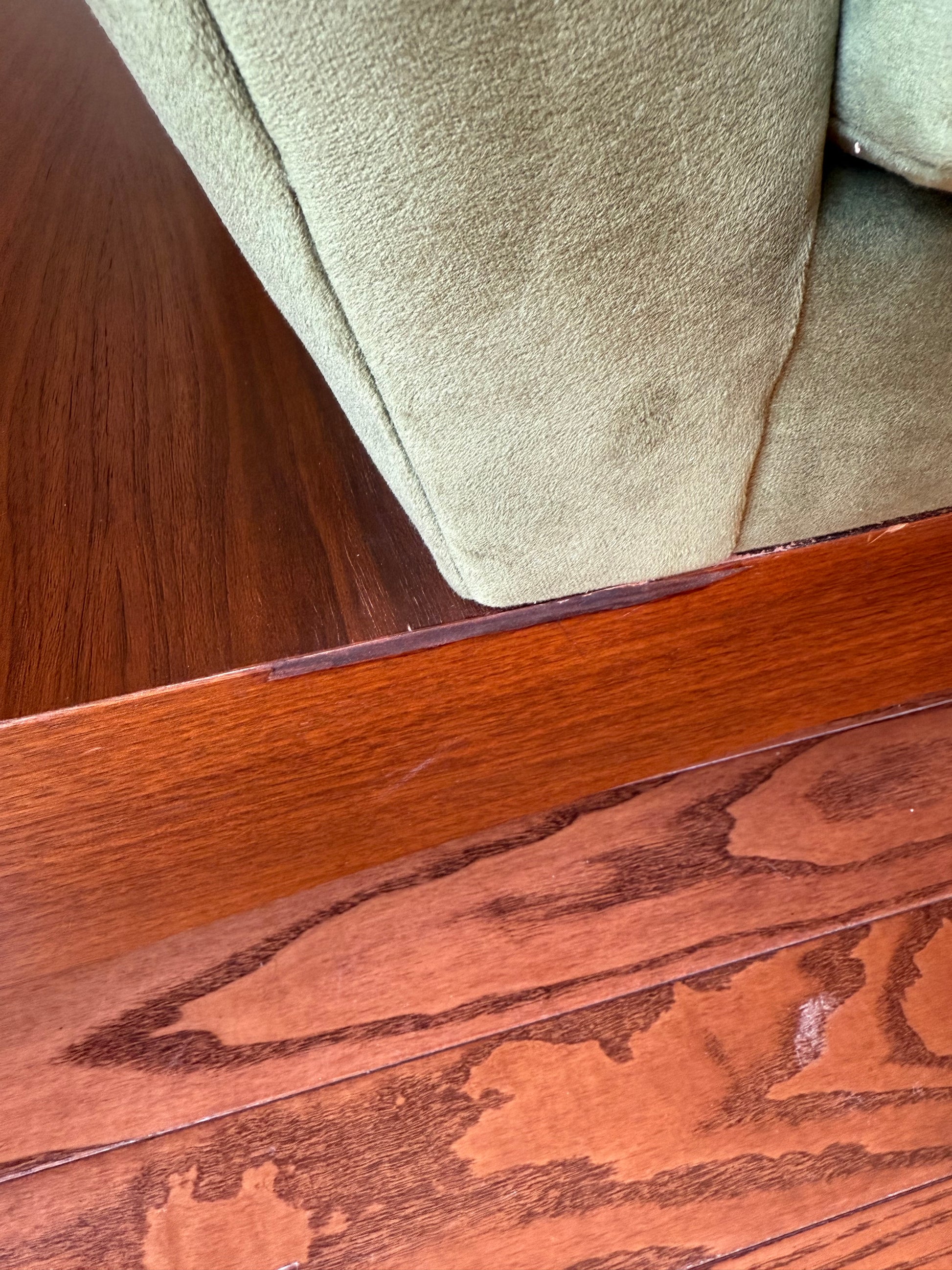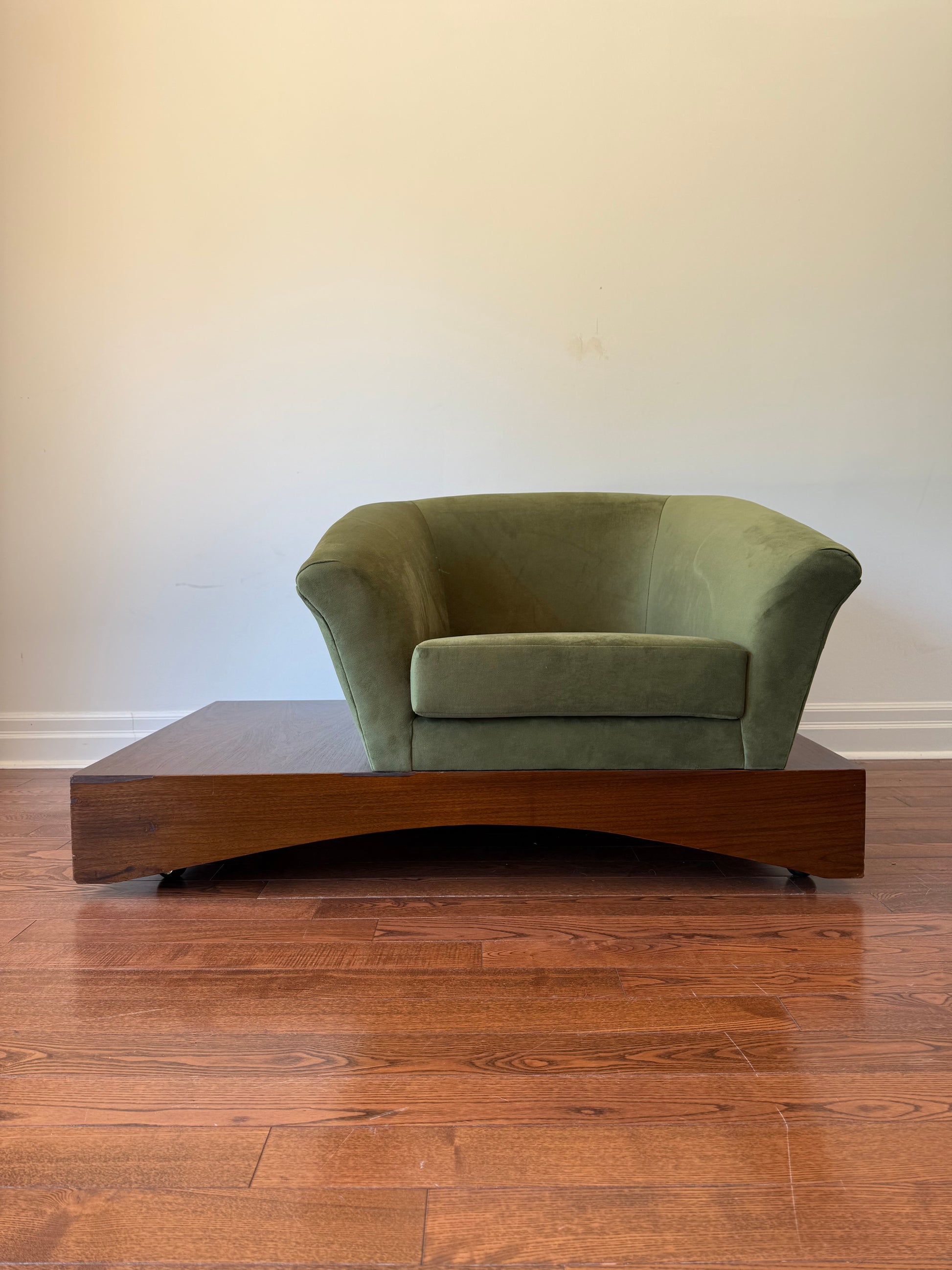 Attributed to Adrian Pearsall. Assumed vintage, 1960s as per original owner. Veneered walnut platform on castors. Platform shows some signs of wear appropriate for age and use [see last photo for example]. Sofa has been carefully restored with new seat deck webbing, new foam seat cushions; reupholstered in a "basil" green coloured velvet composed of 100% polyester with a double rub count exceeding 100 000.